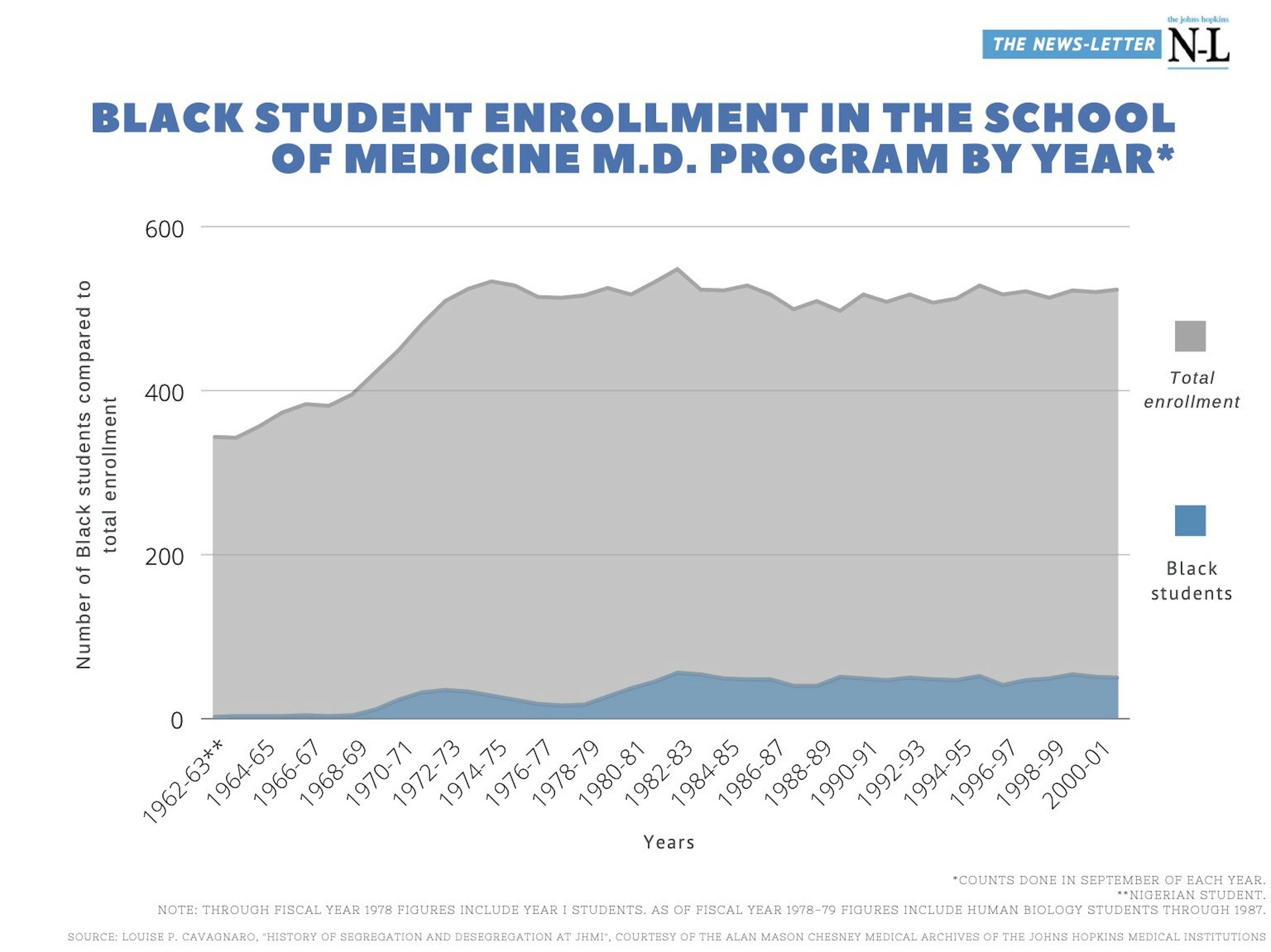 According to Louise Cavagnaro’s “History of Segregation and Desegregation at JHMI,” the School of Medicine admitted its first Black student, James Nabwangu, a student from Nigeria, in 1962. Five years later, Robert Gamble became the first African American student to graduate from the School of Medicine.