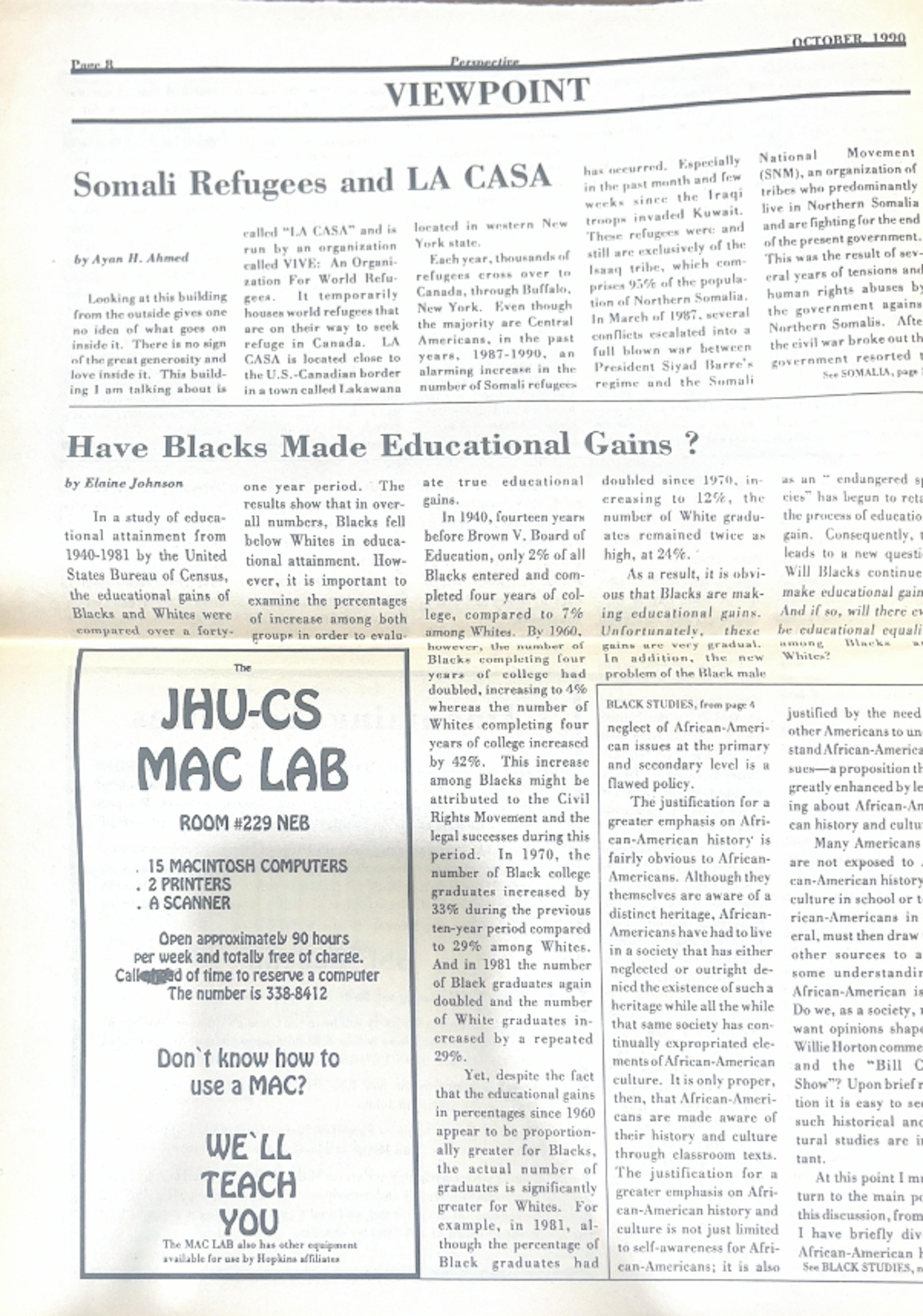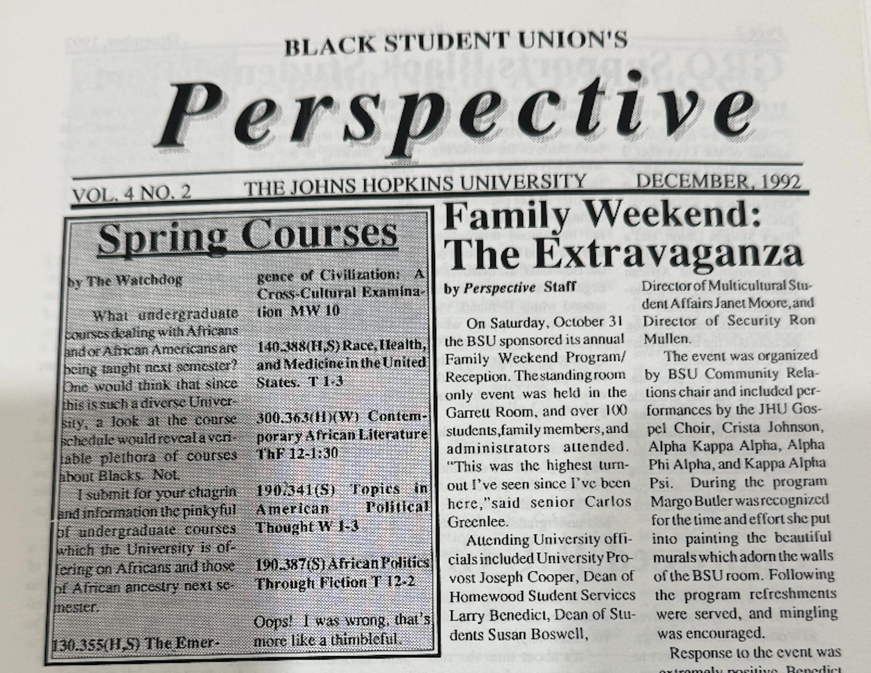 On the front page of the December 1992 edition (Vol. 4, No. 2) is a list of 5 Spring Courses being offered that relate to African-Americans, written by an anonymous student under the pseudonym “the Watchdog.” These include courses such as “Contemporary African Literature” and “African Politics through Fiction.” This critique of the lacking diversity in the University’s course offerings is one of many issues regarding Hopkins’ racial policies raised by Black students in Perspective.
