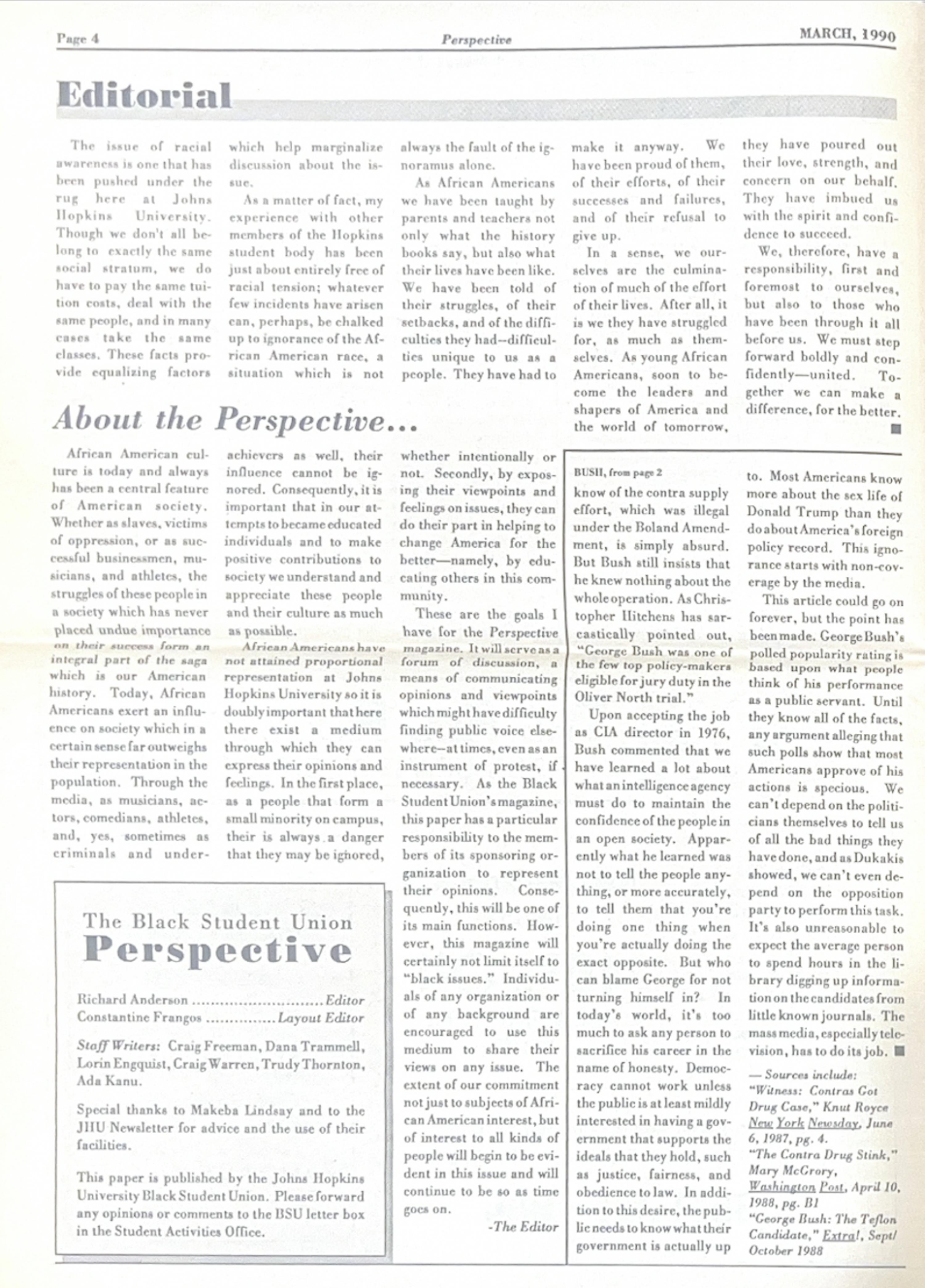 Lying in the University’s Special Collections is a series of print editions of Perspective from the 1990s. The paper uplifted Black student voices; in each addition, BSU members shared their Hopkins experience, news writers covered domestic and international events, editors addressed the University’s progress in promoting an inclusive on-campus community and poets expressed themselves through advocacy-driven creative writing. The University recognized the BSU as a student organization in 1969, originally in tandem with the 1960s Civil Rights Movement. Perspective, as such, grew as an extension of BSU’s mission to improve diversity and, as the name suggests, amplify Black student perspectives. In the March 1990 editorial, Richard Anderson, Perspective editor, shared how published opinions are intended to come from the minority, sometimes even serving as an “instrument of protest.”