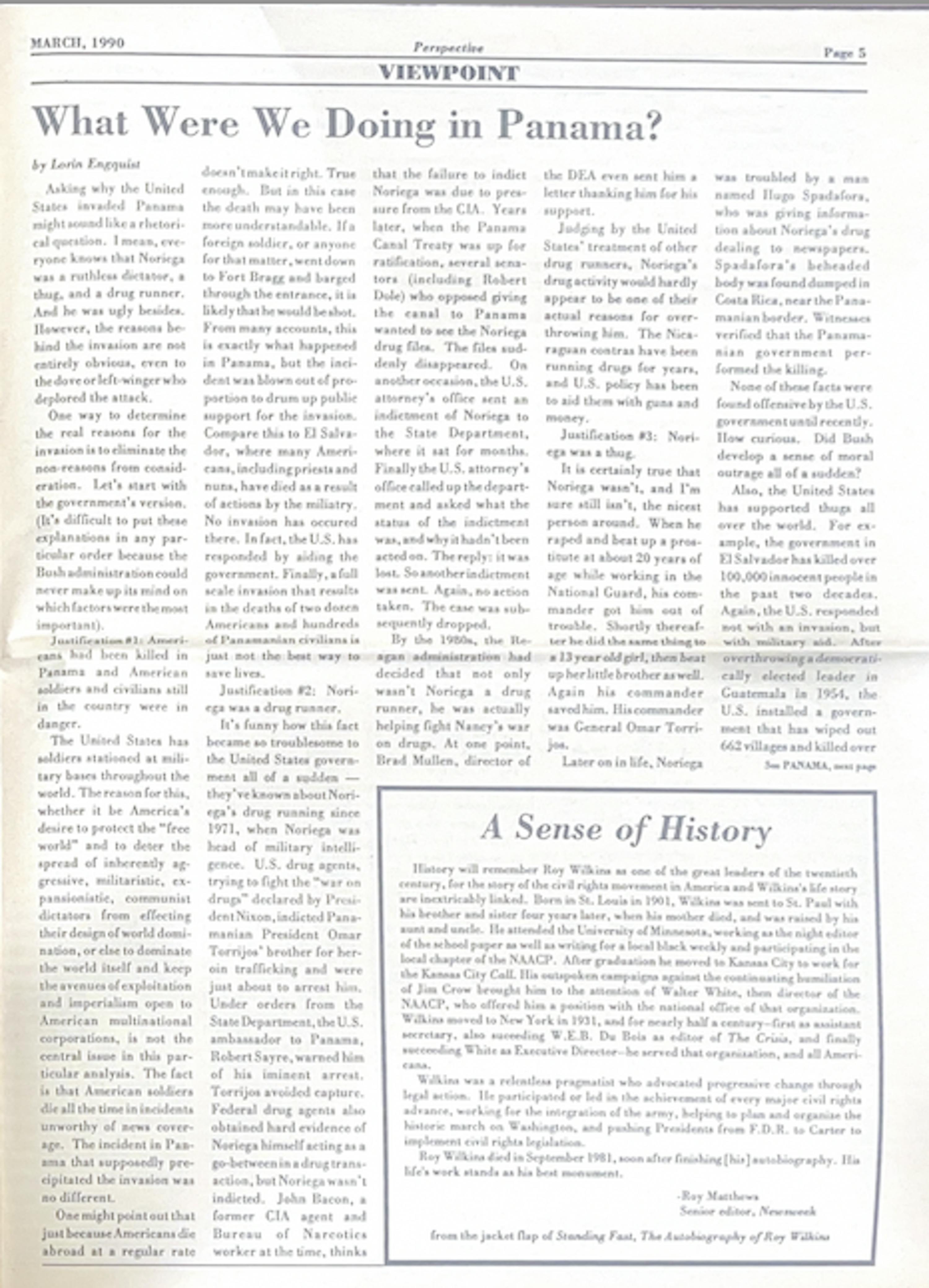 The March 1990 edition of Perspective reports on global conflicts, primarily focusing on newly independent nations and post-colonial adjustments. For example, articles explained the history behind “LA CASA,” a Somali refugee shelter in Canada, analyzed statistics of Black students following the ruling in Brown v. Board of Education and questioned US involvement in Panama, highlighting local atrocities. This edition also highlights notable leaders of the Civil Rights Movement, including Roy Wilkins, who became the Executive Director of the NAACP amidst his advocacy to implement civil rights legislation and integrate the US Army.