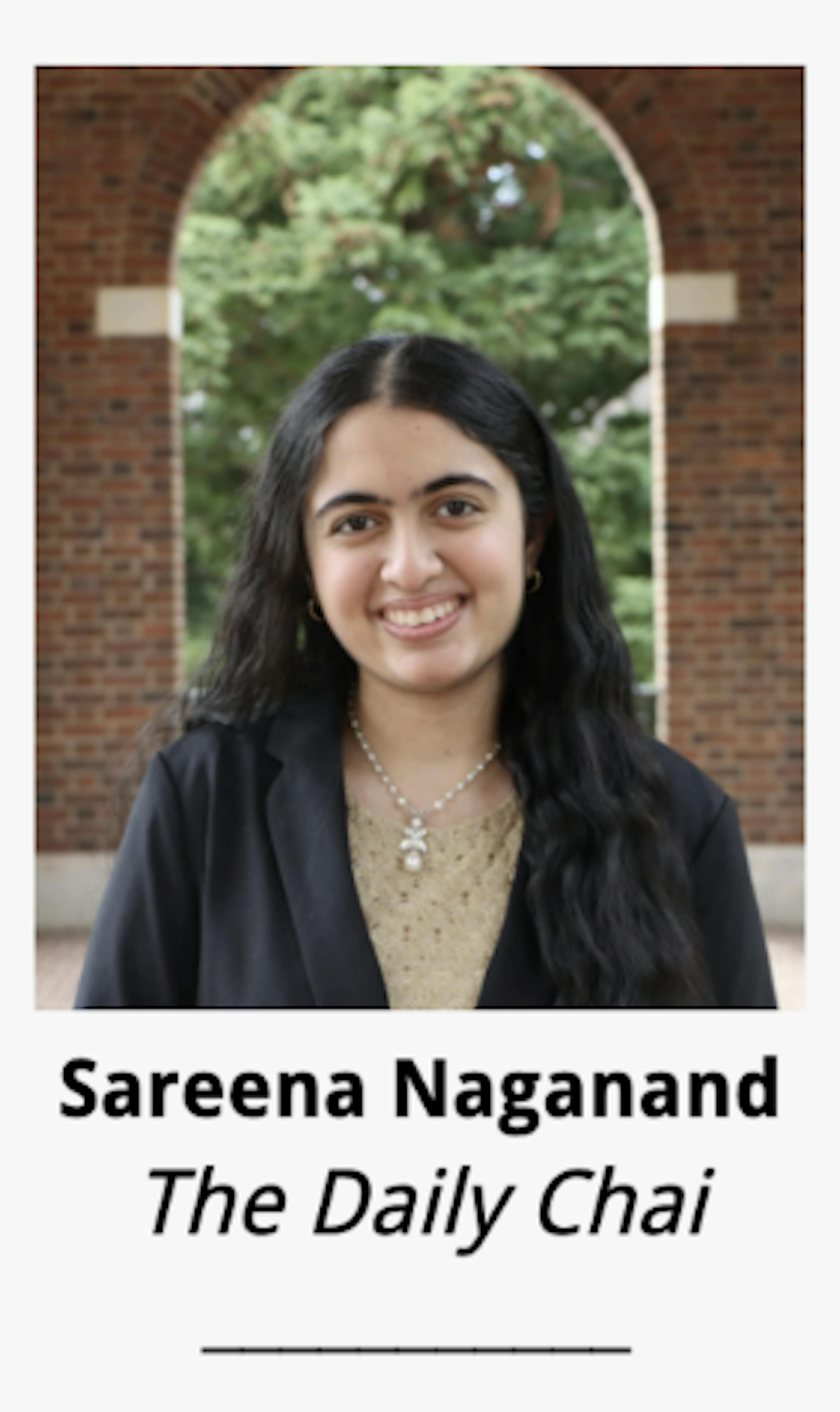 Sareena Naganand is a sophomore from Piscataway, N.J. majoring in Biomedical Engineering. Her column, “The Daily Chai,“ is about finding happiness in simple, insignificant moments: the kind that makes us smile, wrapping around us like the warmth that comes from drinking a cup of tea.