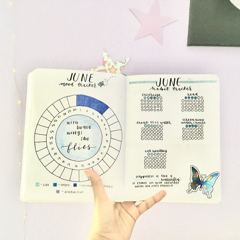 My journey started in 6th grade with a classic pink “Michael’s” dotted journal. I was 12 years old, watching Amanda Rach Lee on repeat and scouring Pinterest for the perfect “key” and bucket list. What started out as an innocent hobby turned into a four-year high school ritual. Every year began with the satisfying crack of a new spine, labeling the inside “Property of: Eesha Bellad.” Before planning began, I’d map out my new year’s resolutions, favorite songs, book trackers and, of course, a dedicated “doodle page.” Each month had a theme: snowflakes for January, hearts for February, butterflies for June. Every spread was a coordinated dream of fonts, stickers and shades.